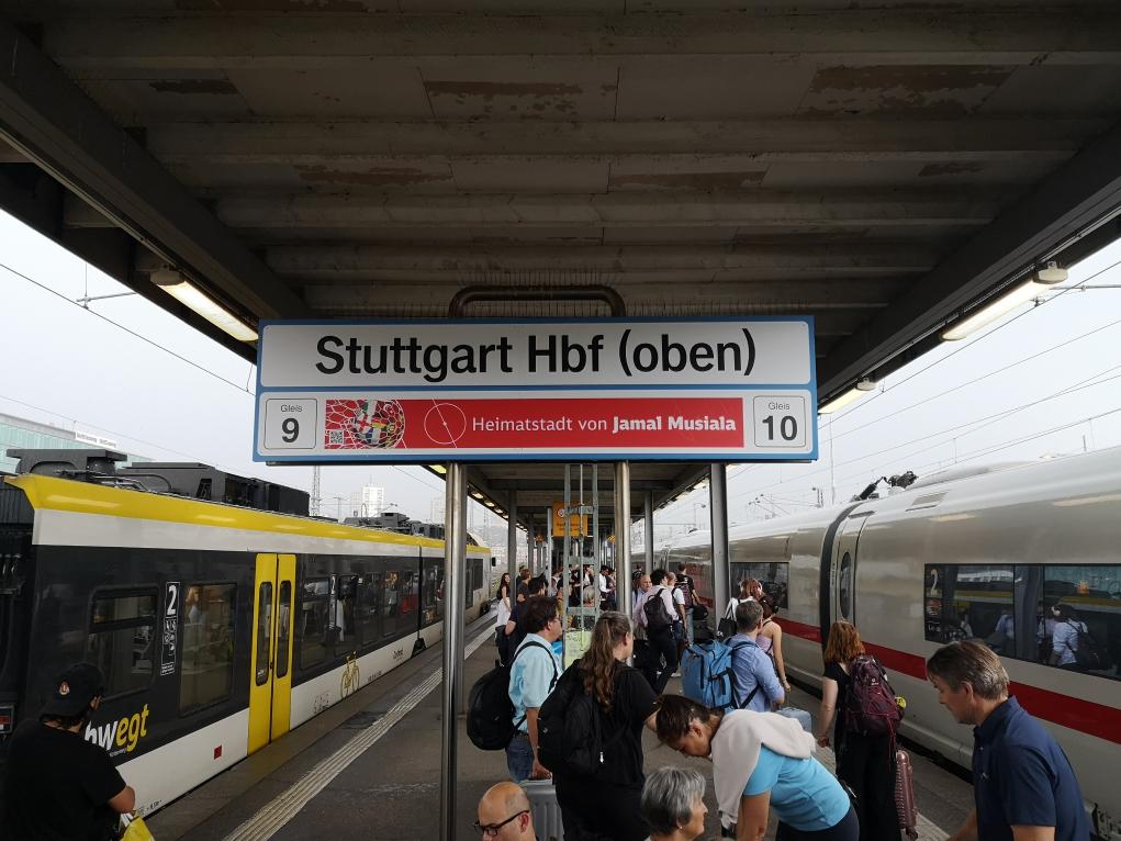 图为斯图加特火车站站台,红底白字写着“穆夏拉的家乡”