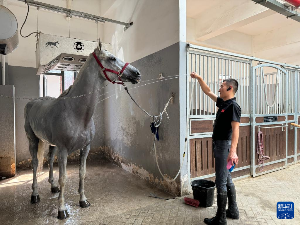 7月2日上午,在贵阳国际马术运动中心,工作人员冲洗集训马匹。新华社记者 周宣妮 摄