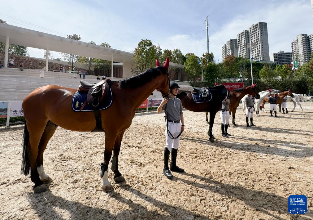 7月2日上午,在贵阳国际马术运动中心,工作人员将马匹牵出,以待训练。新华社记者 周宣妮 摄
