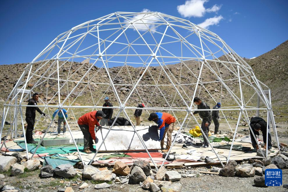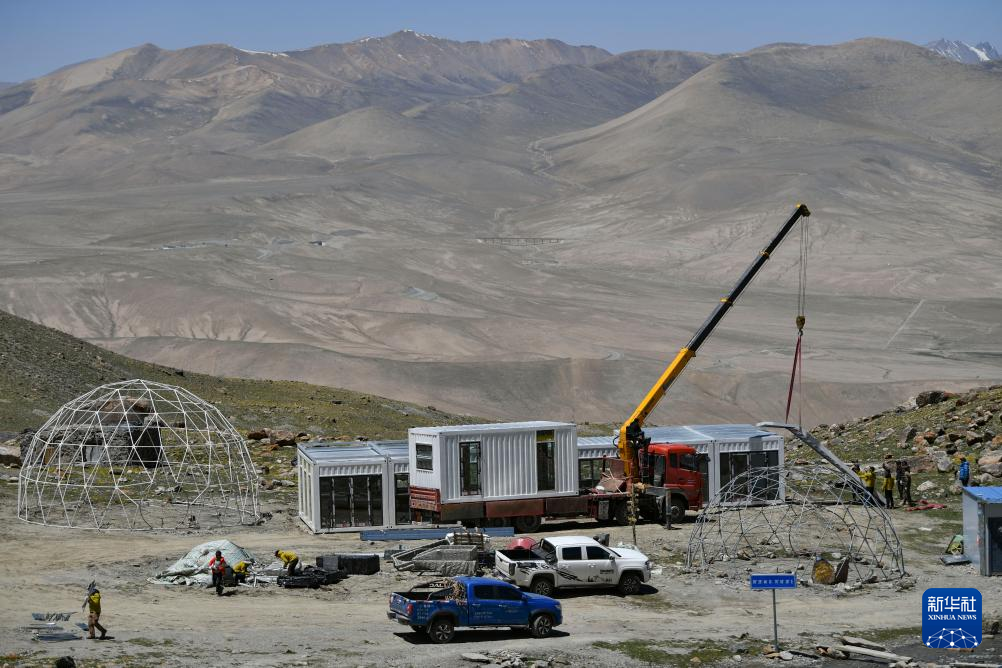 这是新疆慕士塔格峰山脚下的一处登山营地建设现场(7月3日摄)。新华社记者 胡虎虎 摄