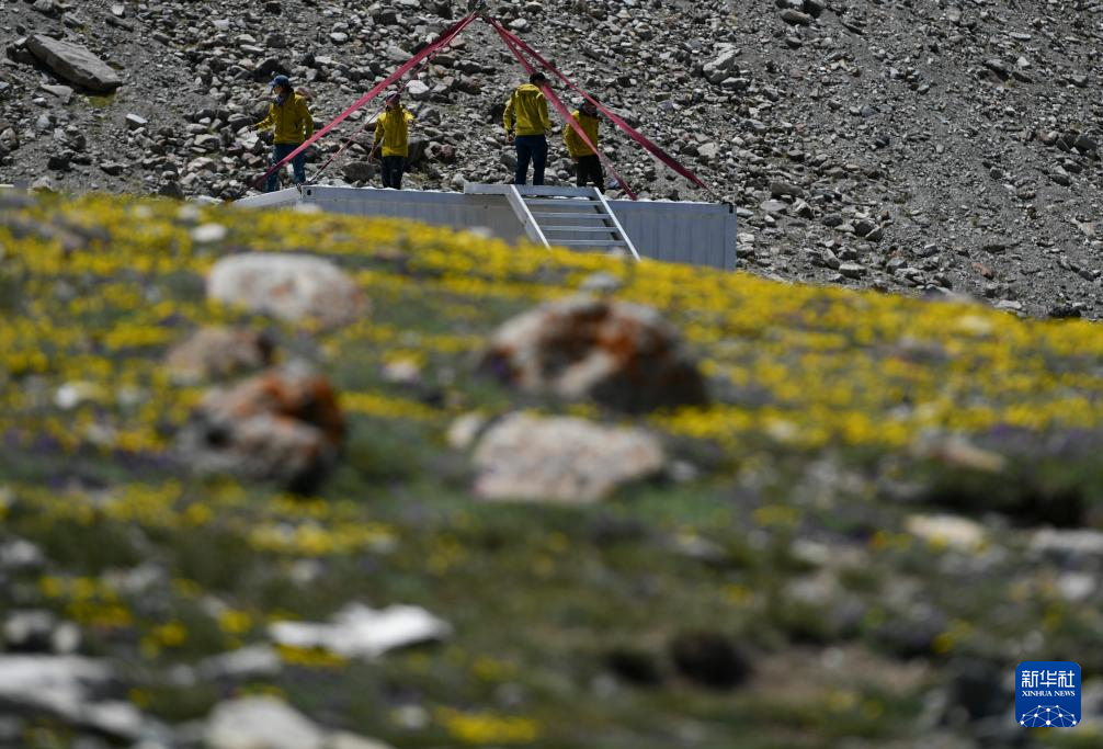 7月3日,人们在新疆慕士塔格峰海拔4300米左右的山坡修建登山营地。新华社记者 胡虎虎 摄