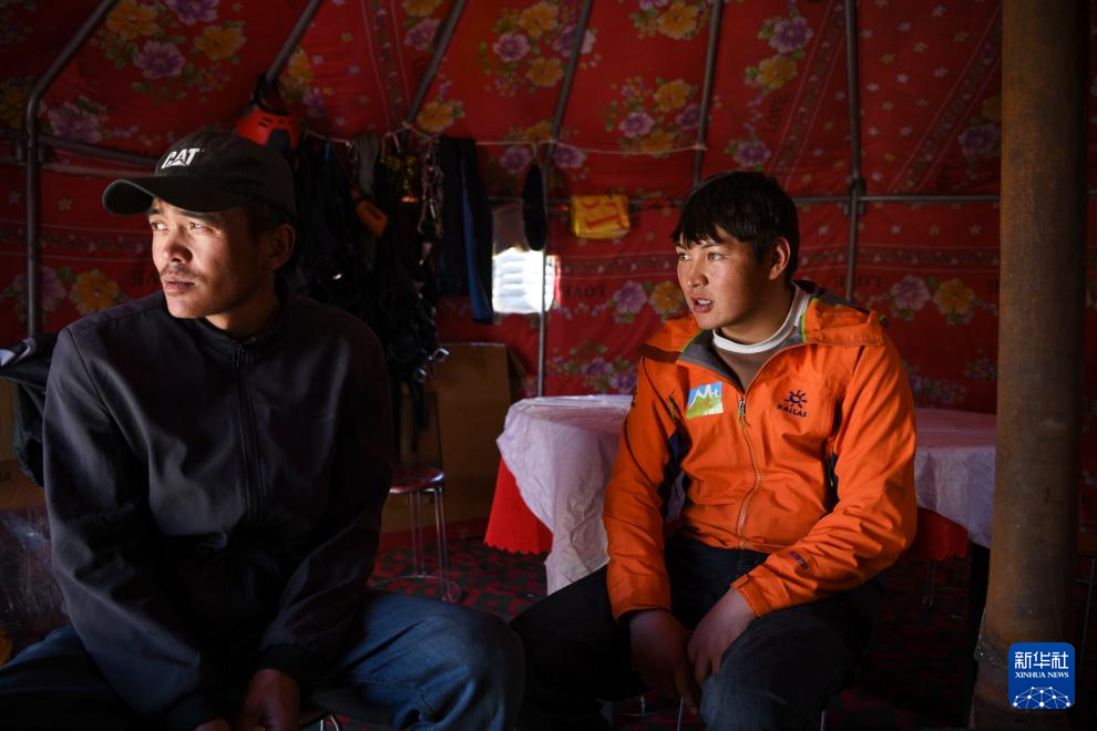7月3日,从事高山搬运的苏巴什村牧民麦麦提图尔汗·拜克日(右)、从事营地后勤服务的牧民阿卜杜克力木·塞外都拉在登山营地休息。新华社记者 胡虎虎 摄