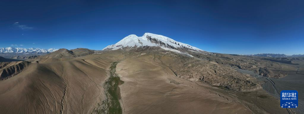 这是在新疆阿克陶县布伦口乡苏巴什村拍摄的慕士塔格峰及周边山脉景观(7月3日摄,无人机全景照片)。新华社记者 胡虎虎 摄