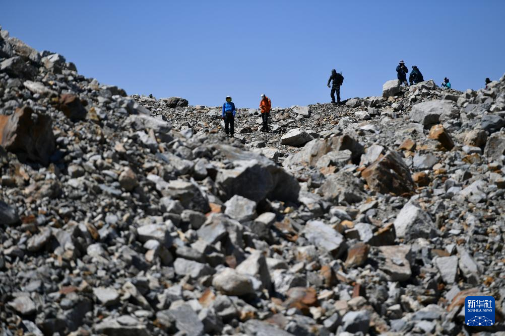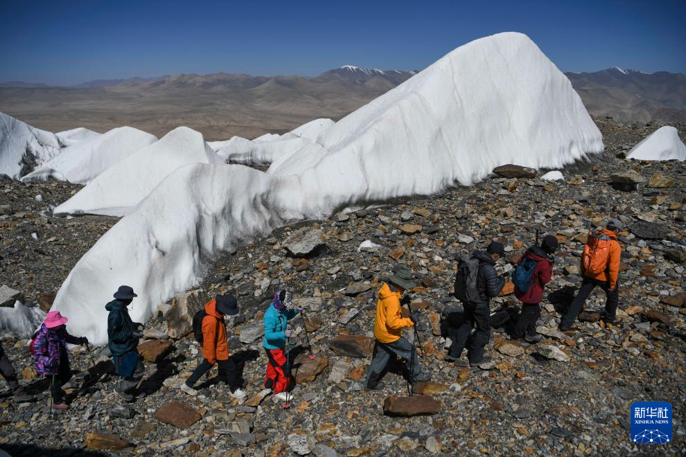 7月3日,登山爱好者在新疆慕士塔格峰高海拔地带进行适应拉练。新华社记者 胡虎虎 摄