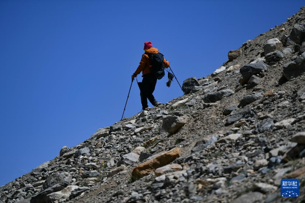 7月3日,一名登山爱好者在完成慕士塔格峰海拔6000多米的C2营地适应拉练后下山。新华社记者 胡虎虎 摄