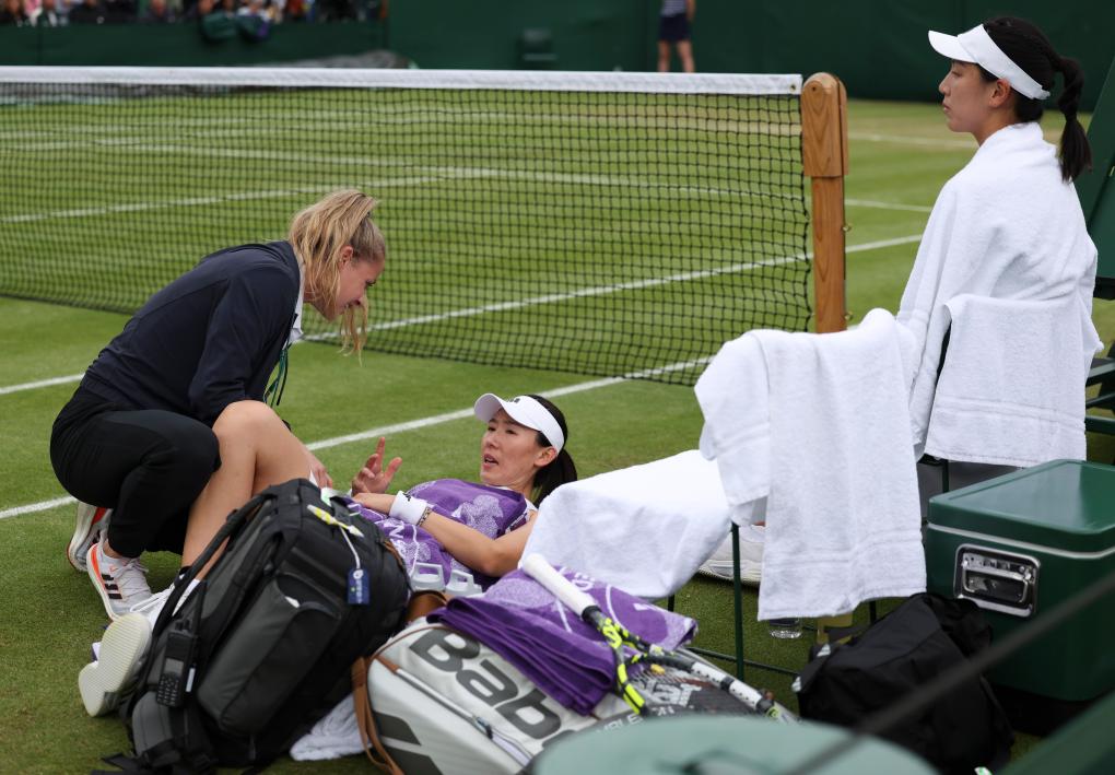 7月3日,郑赛赛(下)在第一盘结束后接受治疗。新华社记者 韩岩 摄