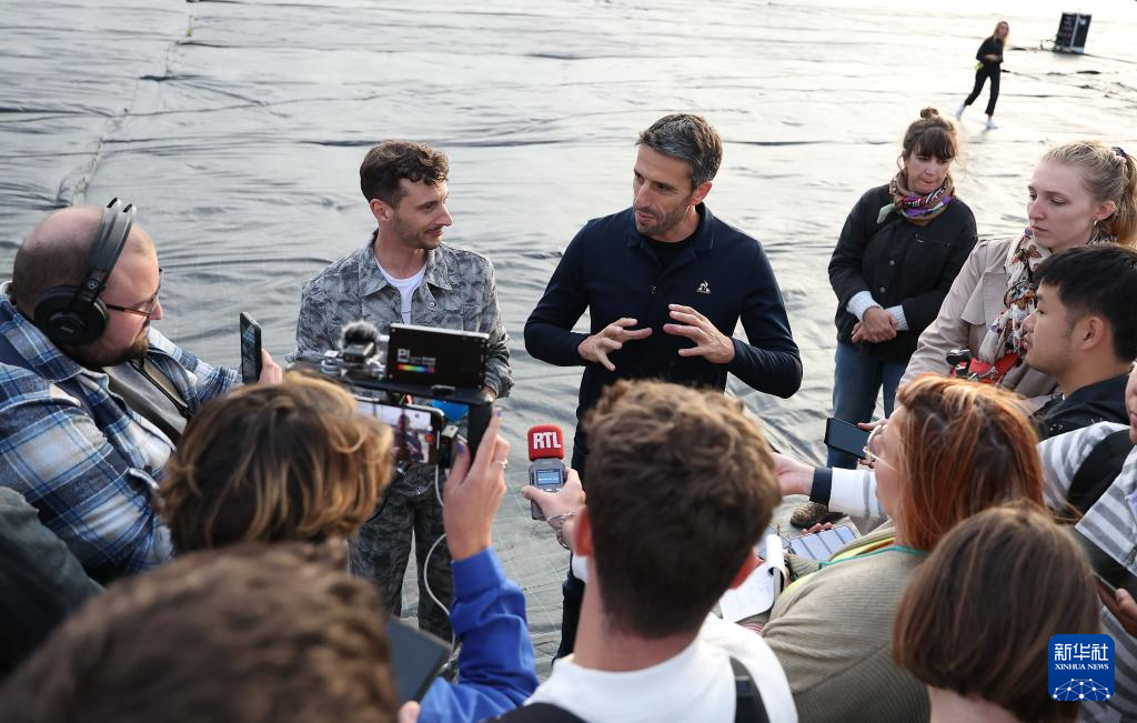 7月3日,巴黎奥组委主席托尼·埃斯坦盖(中)和闭幕式导演托马斯·乔利(中左)在闭幕式彩排前接受媒体采访。新华社记者 曹灿 摄