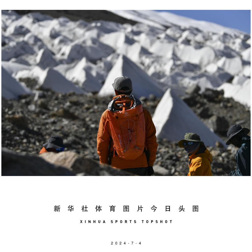 7月3日,登山爱好者在新疆慕士塔格峰高海拔地带进行适应拉练。