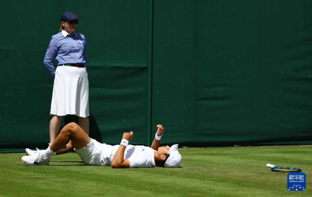 7月4日,商竣程在比赛中滑倒。新华社/路透