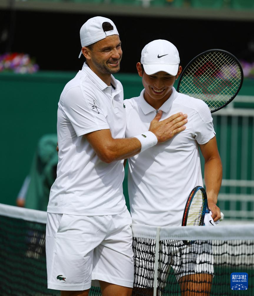 7月4日,商竣程(右)与迪米特洛夫在赛后拥抱致意。新华社/路透