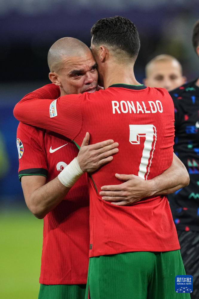 7月5日,葡萄牙队球员克·罗纳尔多(右)比赛后安慰队友佩佩。新华社记者 潘昱龙 摄