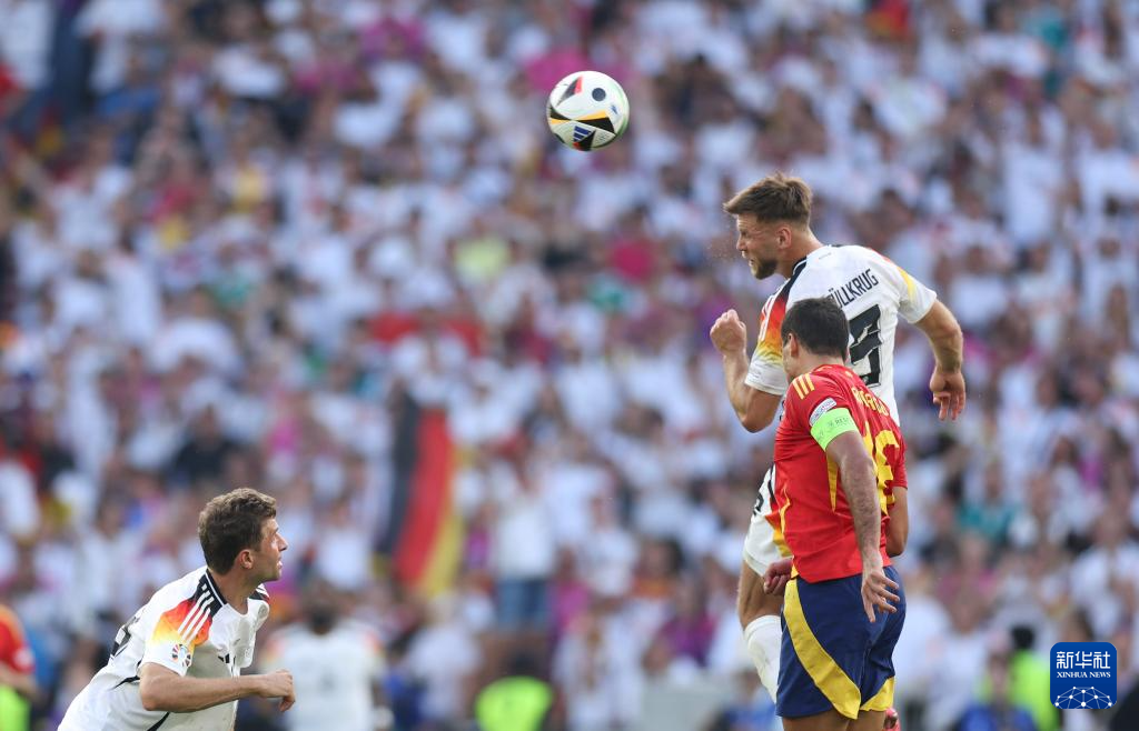 7月5日,德国队球员菲尔克鲁格(上)在比赛中争顶头球。新华社记者 白雪飞 摄