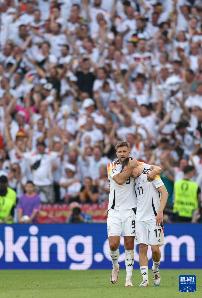 7月5日,德国队球员维尔茨(右)与队友菲尔克鲁格庆祝进球。新华社记者 白雪飞 摄
