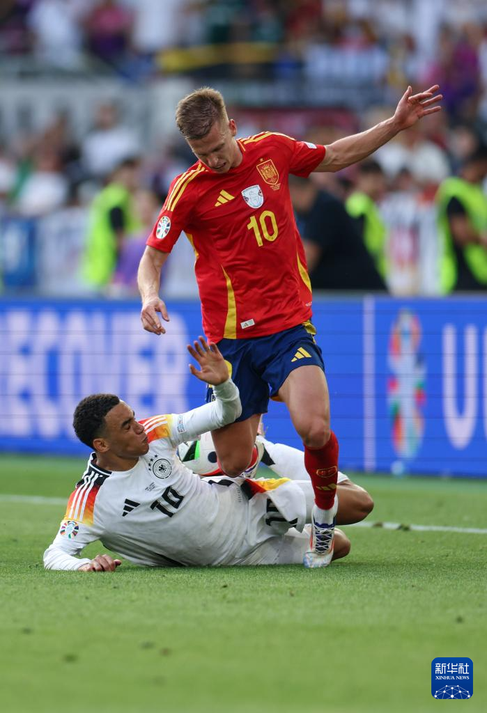 7月5日,德国队球员穆夏拉(下)与西班牙队球员奥尔莫拼抢倒地。新华社记者 白雪飞 摄
