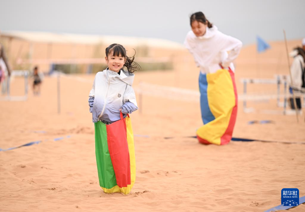 7月7日,参赛选手在沙漠亲子障碍赛中参加袋鼠跳项目。新华社记者 冯开华 摄