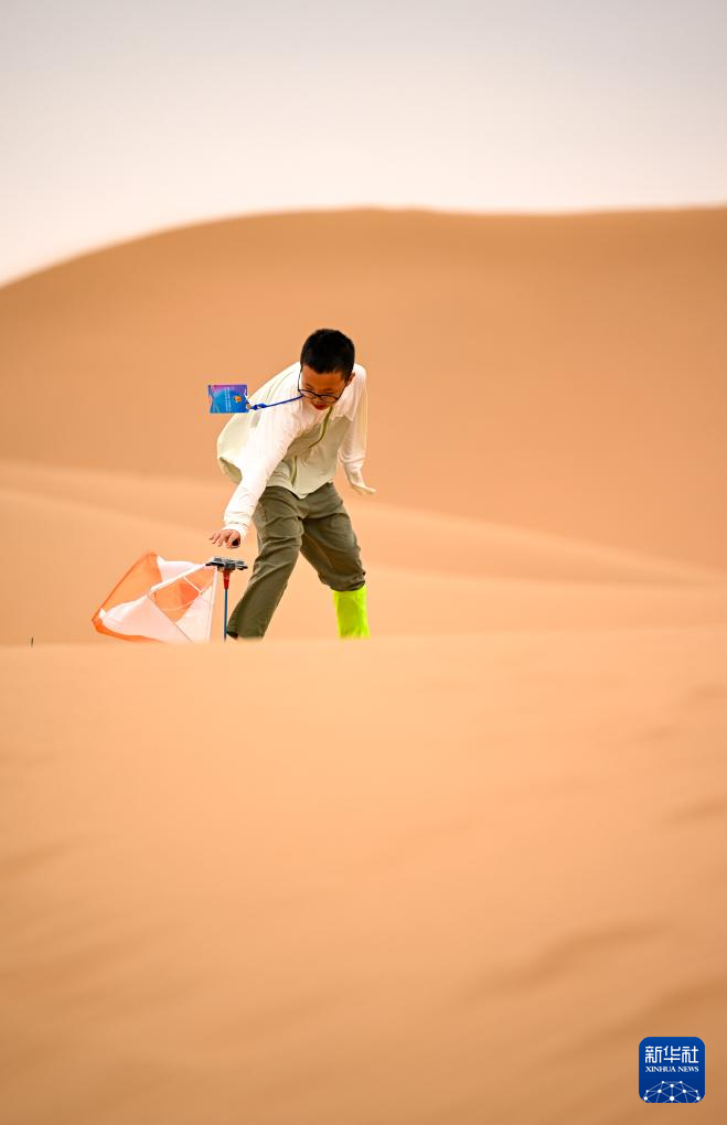 7月7日,参赛选手在沙漠亲子定向寻宝比赛中打卡。新华社记者 冯开华 摄