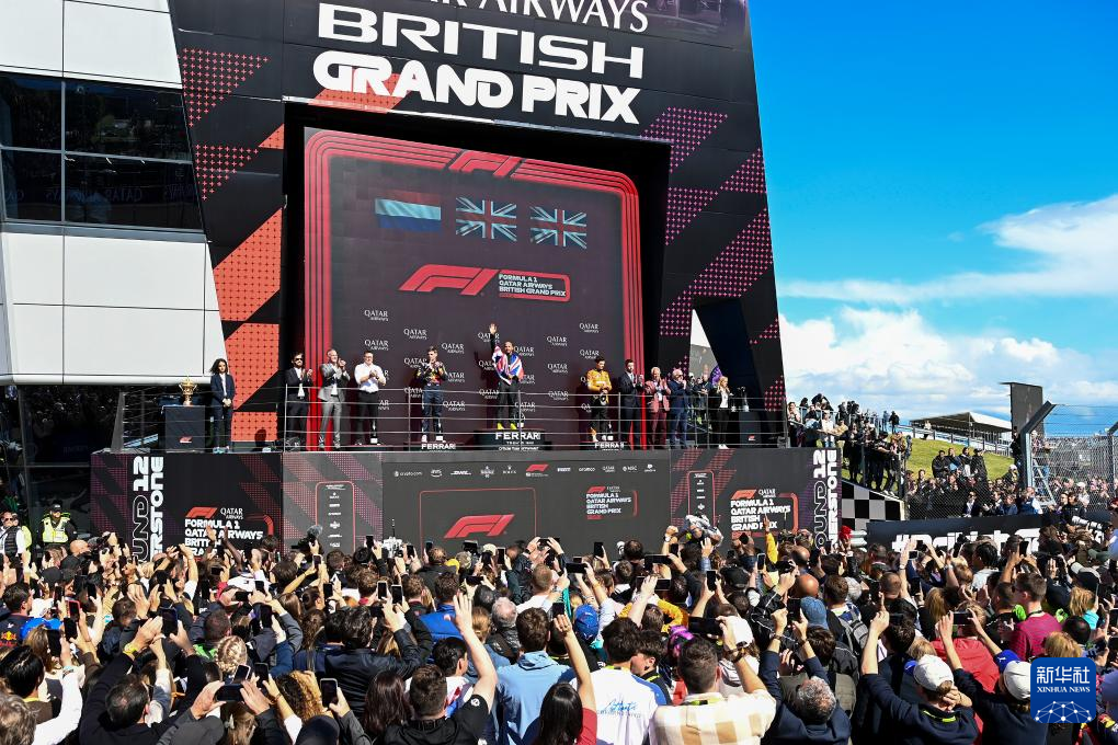这是7月7日拍摄的英国大奖赛颁奖仪式现场。新华社记者 吴鲁 摄