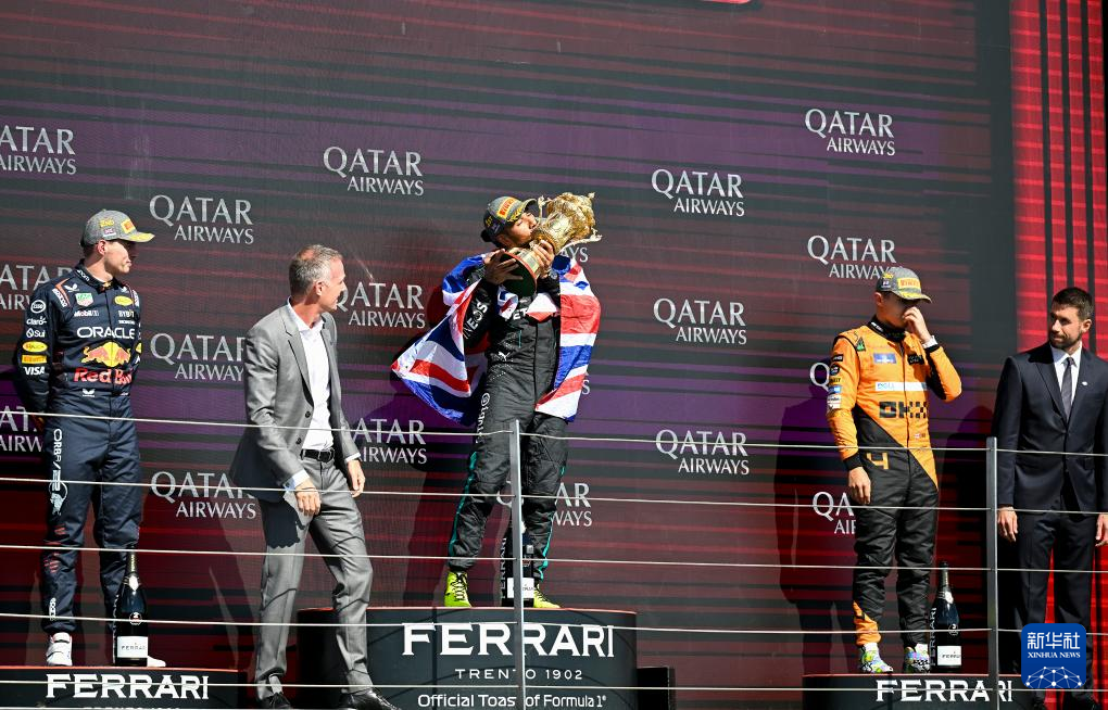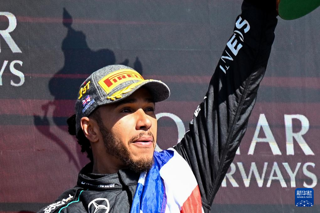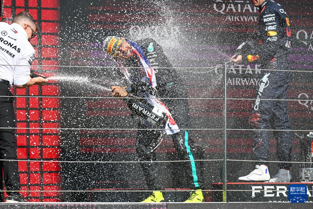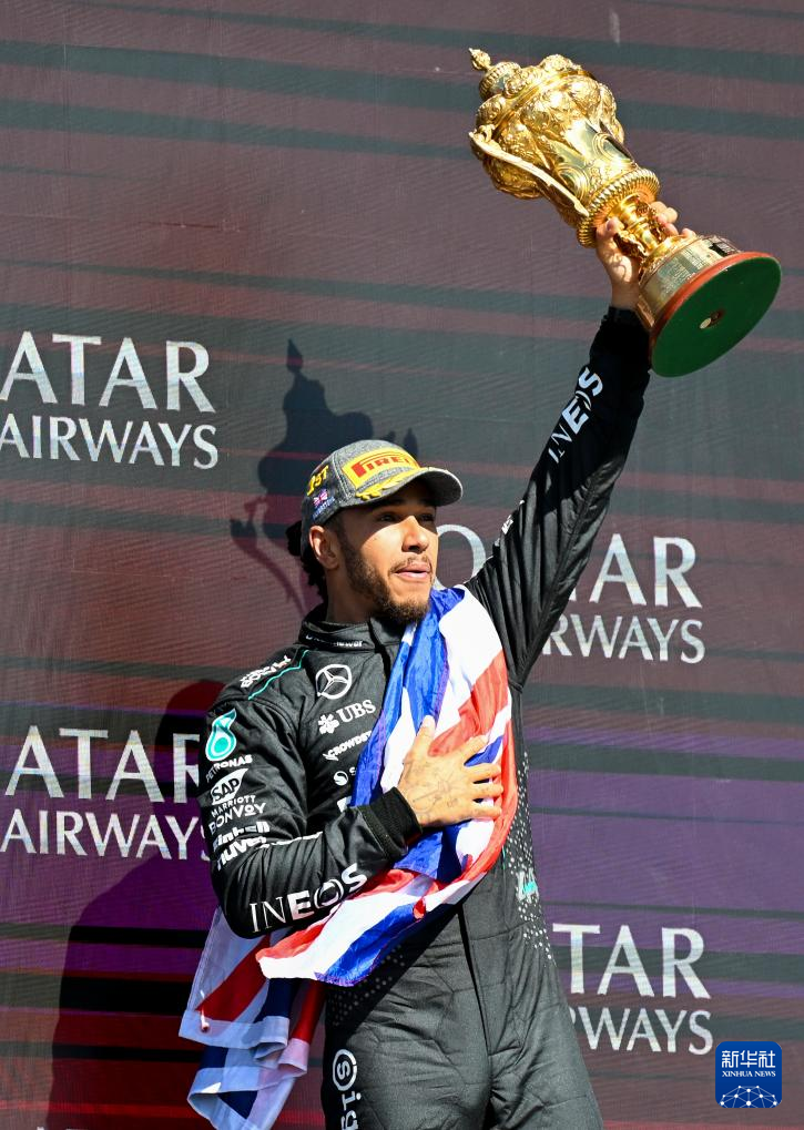 7月7日,汉密尔顿在颁奖仪式上庆祝。新华社记者 吴鲁 摄