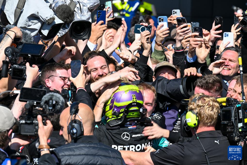 7月7日,汉密尔顿(前中)在比赛后与车队工作人员拥抱庆祝胜利。新华社记者 吴鲁 摄