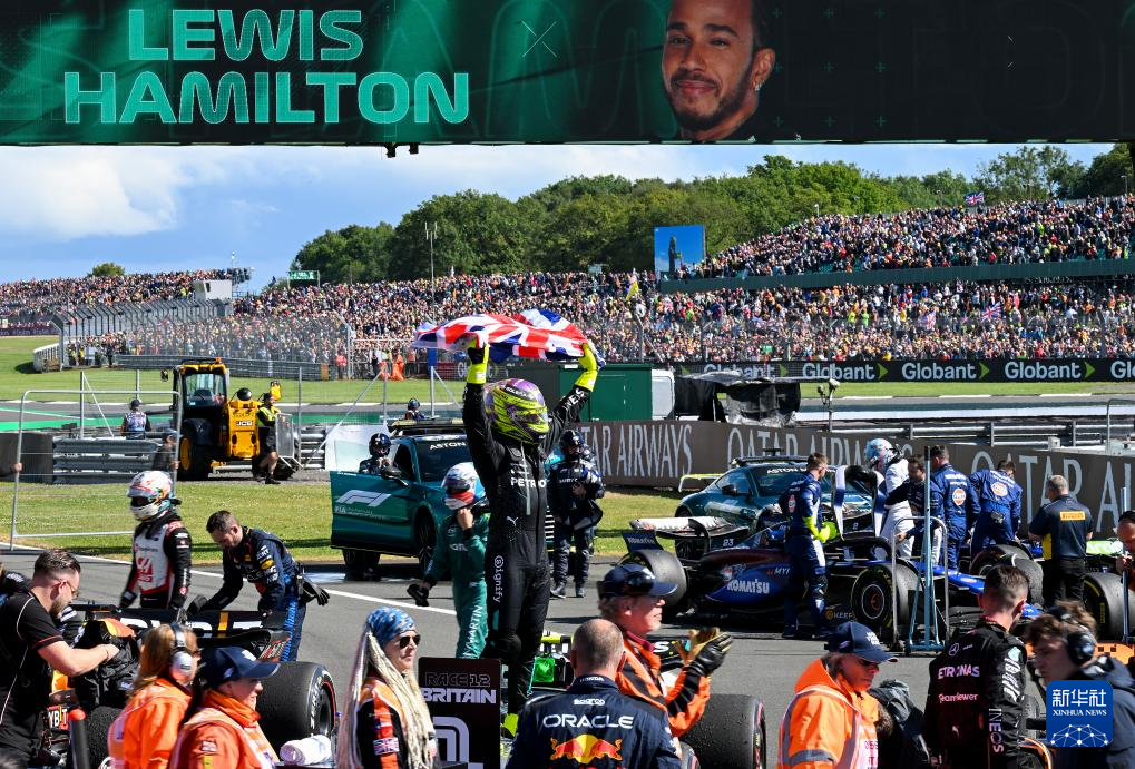 7月7日,汉密尔顿(中)在比赛后向观众挥手致意。新华社记者 吴鲁 摄
