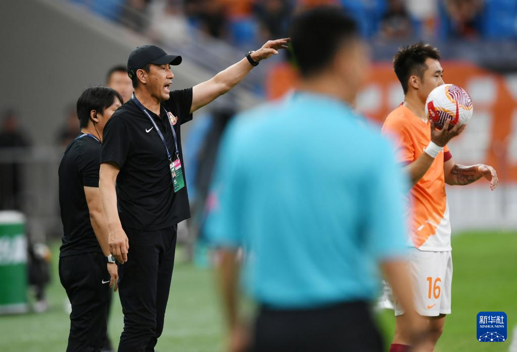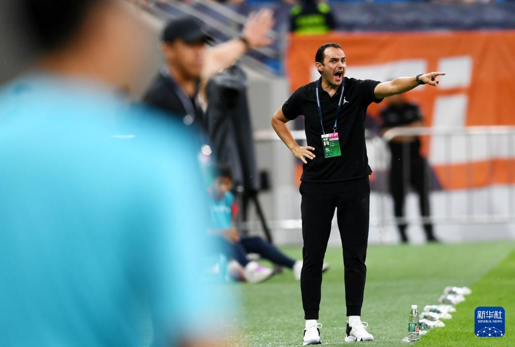 7月7日,青岛海牛队代理主教练亚历山大(右)在比赛中指导球员。新华社记者 李紫恒 摄