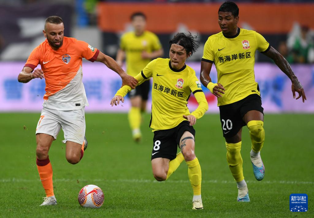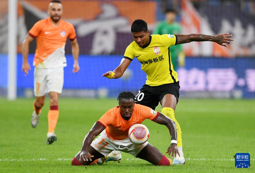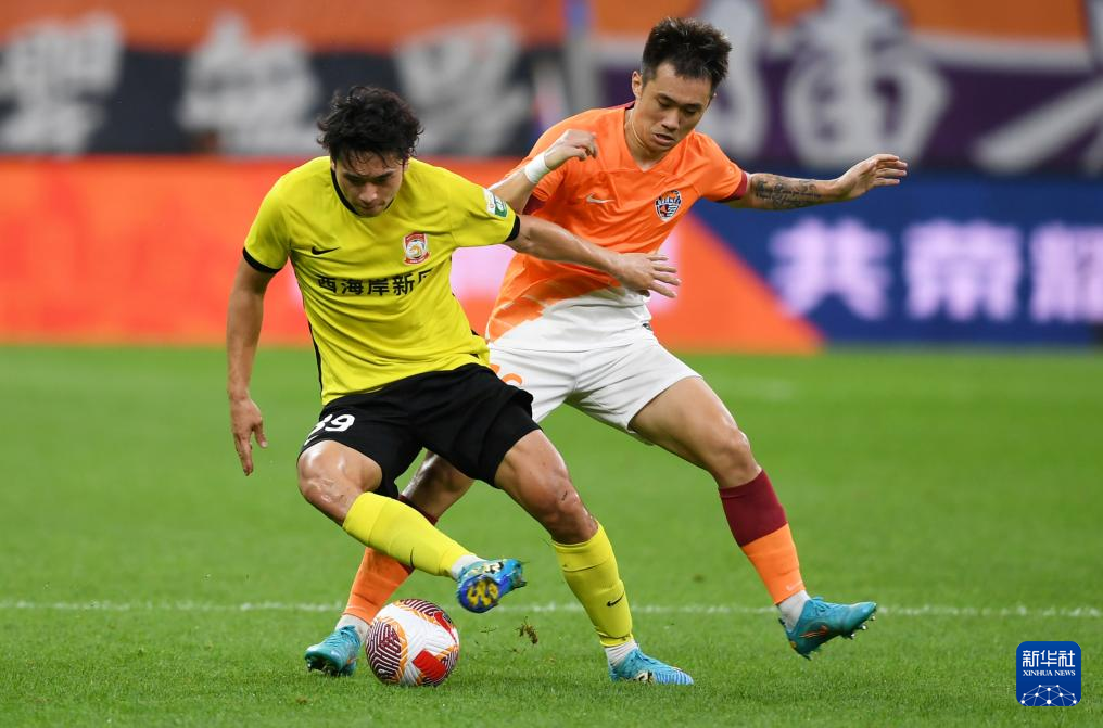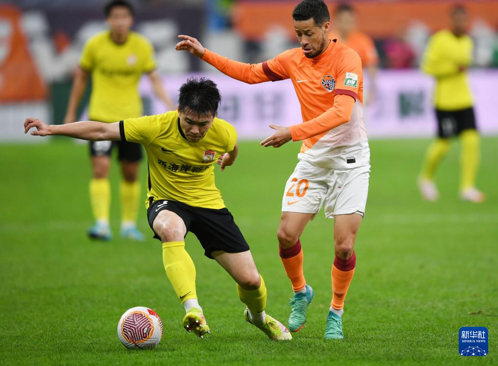 7月7日,青岛西海岸队球员赵宏略(左)与青岛海牛队球员迭戈拼抢。新华社记者 李紫恒 摄
