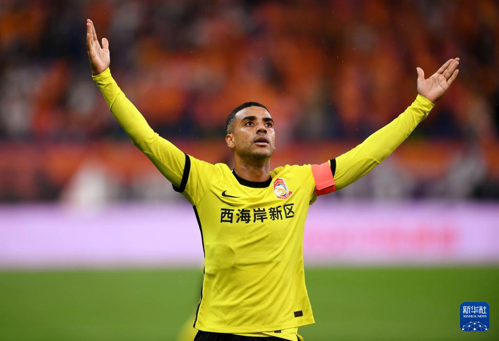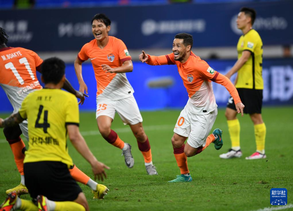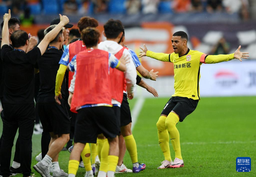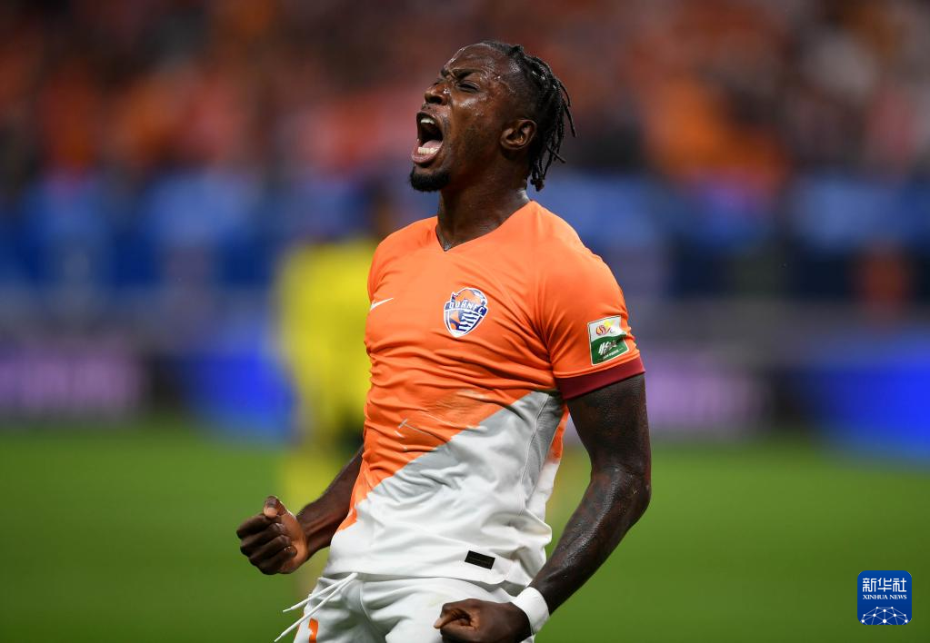 7月7日,青岛西海岸队球员阿兰庆祝进球。新华社记者 李紫恒 摄