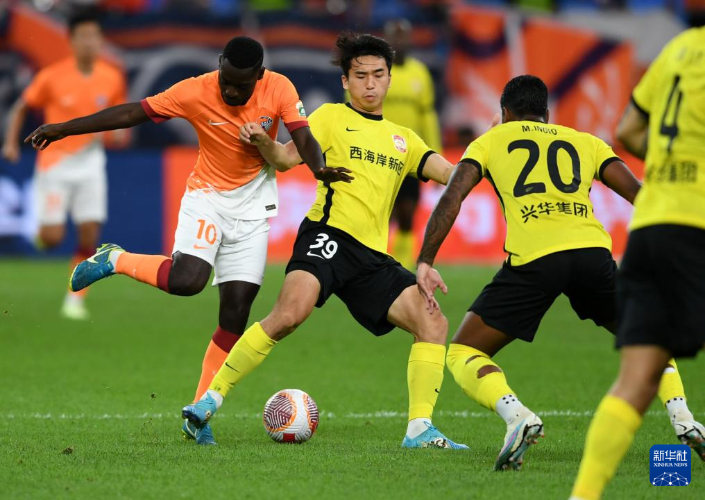 7月7日,青岛西海岸队球员雷文杰(左二)与青岛海牛队球员康瓜(左一)拼抢。新华社记者 李紫恒 摄