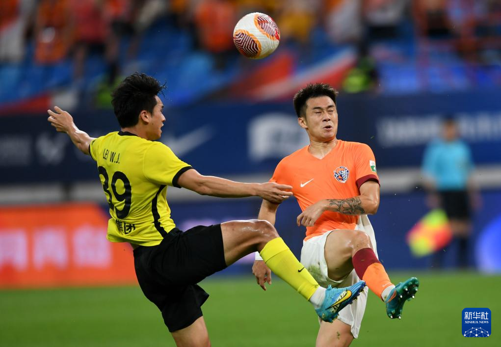 7月7日,青岛西海岸队球员雷文杰(左)与青岛海牛队球员李海龙拼抢。新华社记者 李紫恒 摄