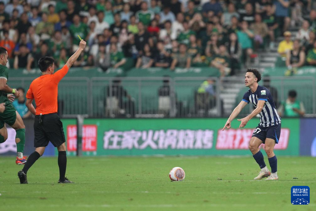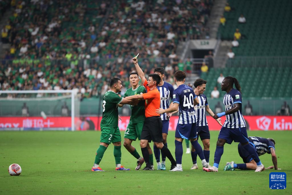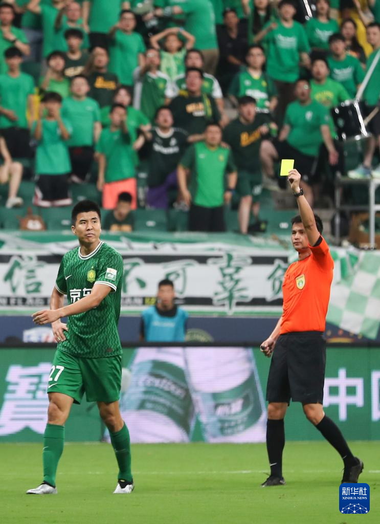 7月7日,主裁判李海新(右)向北京国安队球员王刚出示黄牌。新华社记者 许雅楠 摄