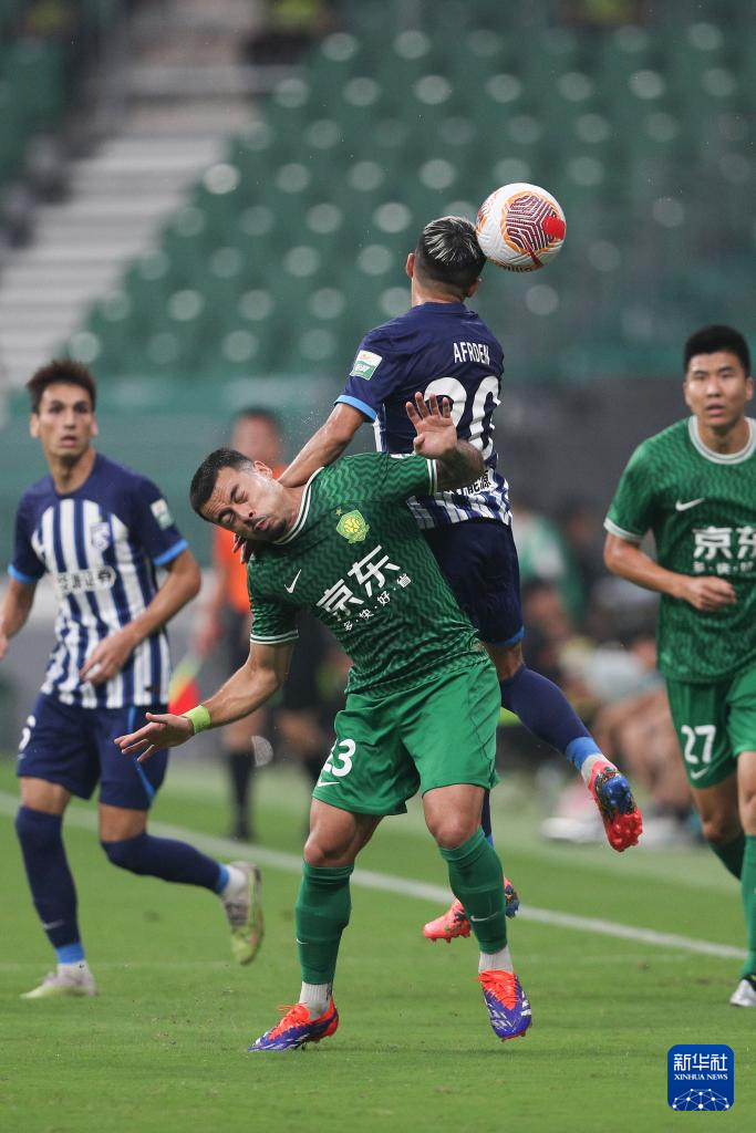 7月7日,北京国安队球员乃比江·莫合买提(下左)在比赛中倒地。新华社记者 许雅楠 摄