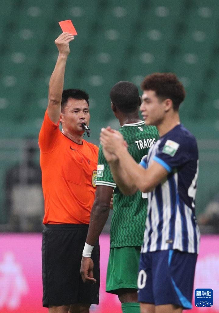 7月7日,主裁判李海新(左)向北京国安队球员马马杜出示红牌。新华社记者 许雅楠 摄