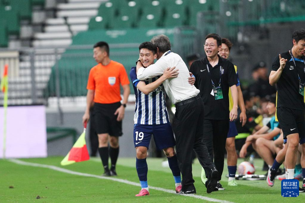 7月7日,武汉三镇队球员刘越(前左)进球后与主教练里卡多拥抱。新华社记者 许雅楠 摄