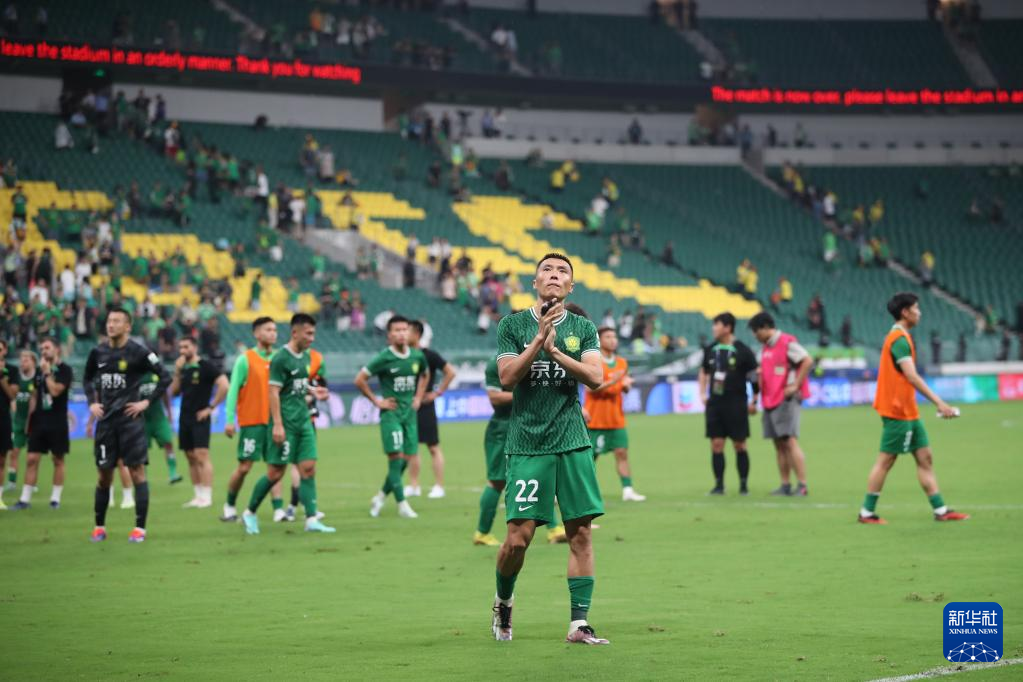 7月7日,北京国安队球员于大宝(前)在比赛后向观众致意。新华社记者 许雅楠 摄