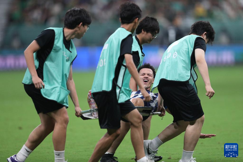 7月7日,武汉三镇队球员达兰(下)在比赛中受伤被抬下场。新华社记者 许雅楠 摄