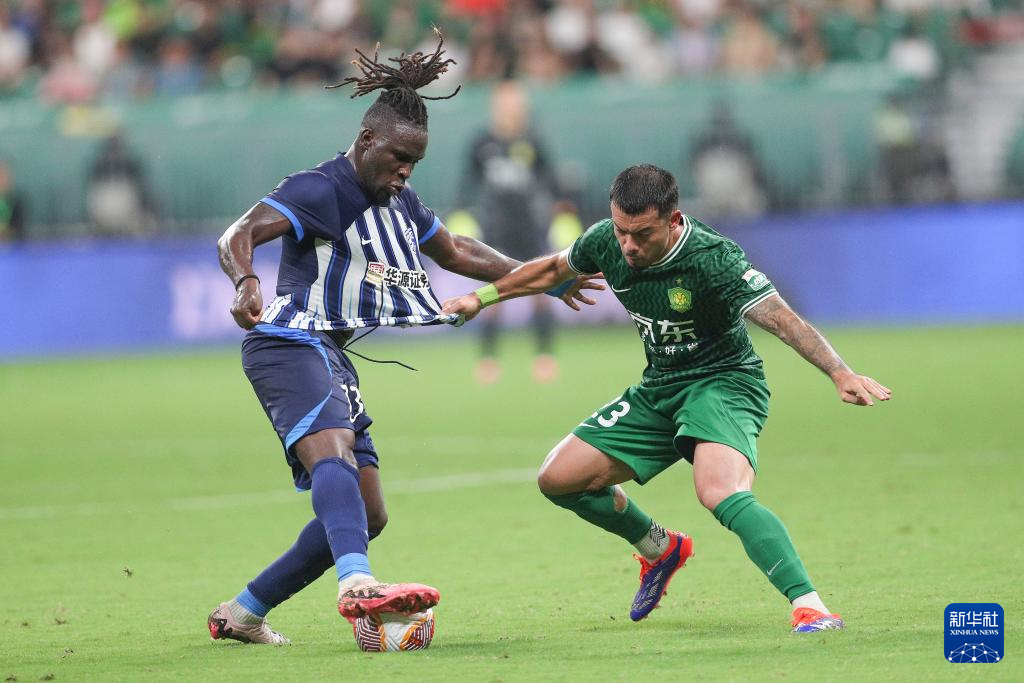 7月7日,北京国安队球员李可(右)与武汉三镇队球员罗马里奥在比赛中拼抢。新华社记者 许雅楠 摄