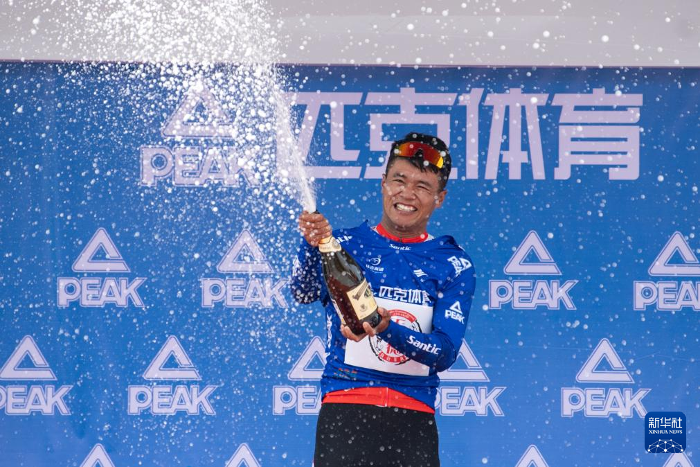 7月7日,青海天佑德车队车手王建财身着代表亚洲最佳的蓝衫在领奖台上庆祝。新华社发(潘彬彬摄)