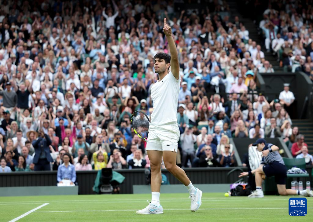 7月7日,阿尔卡拉斯在获胜后庆祝。新华社记者 韩岩 摄