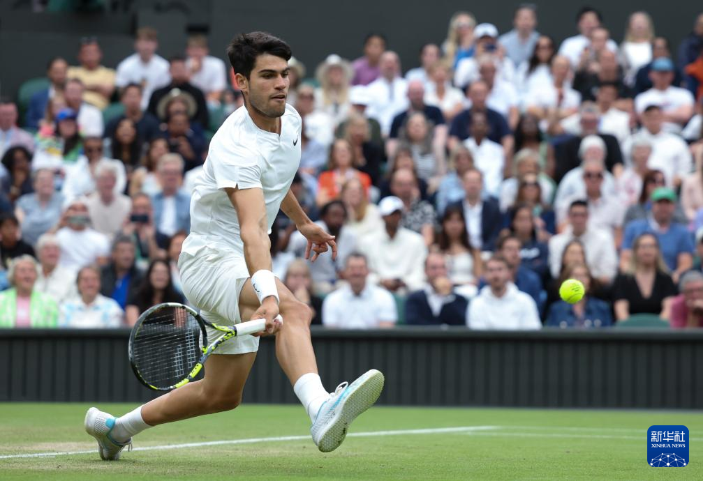 7月7日,阿尔卡拉斯在比赛中回球。新华社记者 韩岩 摄