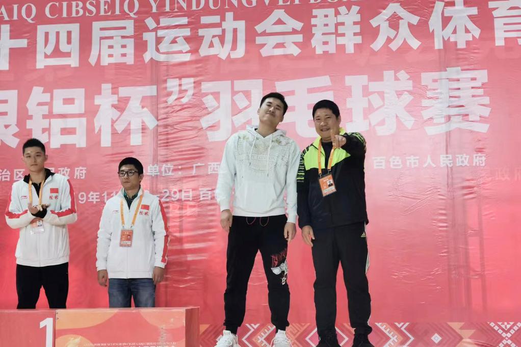 ↑熊俊豪(右二)在广西壮族自治区第十四届运动会群众体育项目羽毛球比赛中夺得名次,赛后与教练(右一)在领奖台上合影(受访者供图)。