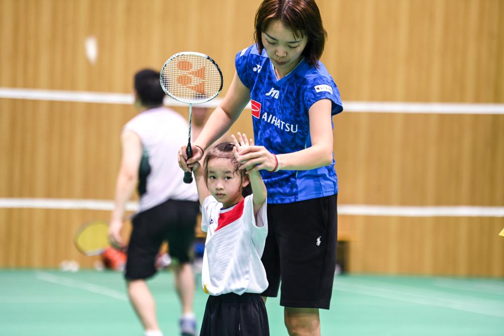 ↑熊俊豪(右)手把手教黄馨媛握拍动作。新华社记者 曹祎铭 摄