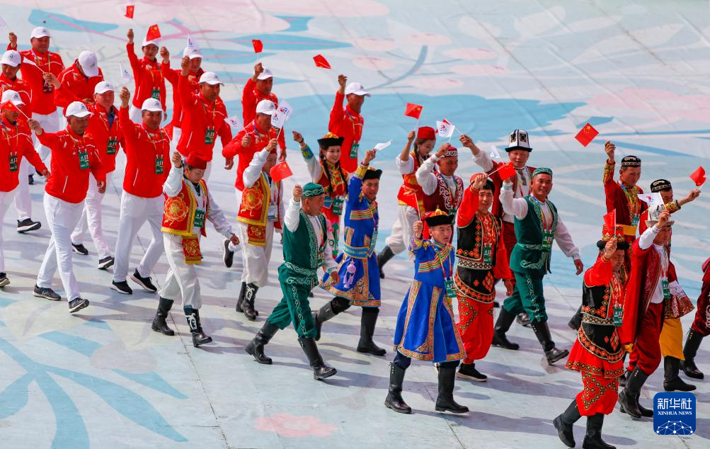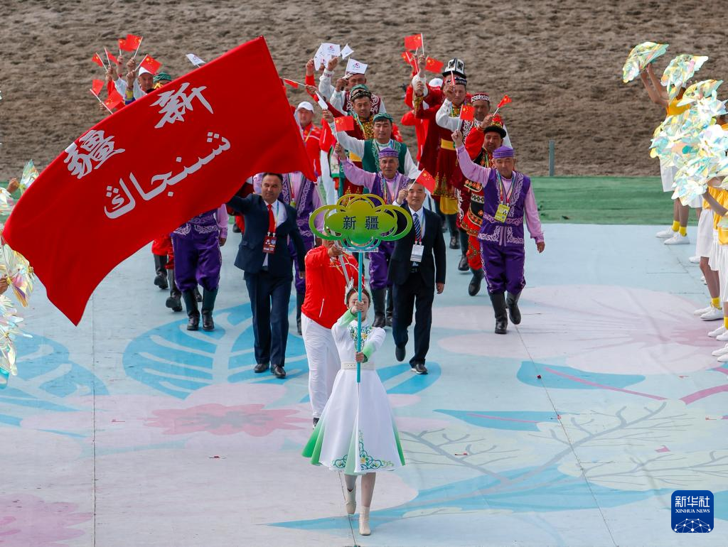 7月8日,新疆维吾尔自治区代表团在开赛仪式上入场。新华社记者 陈朔 摄