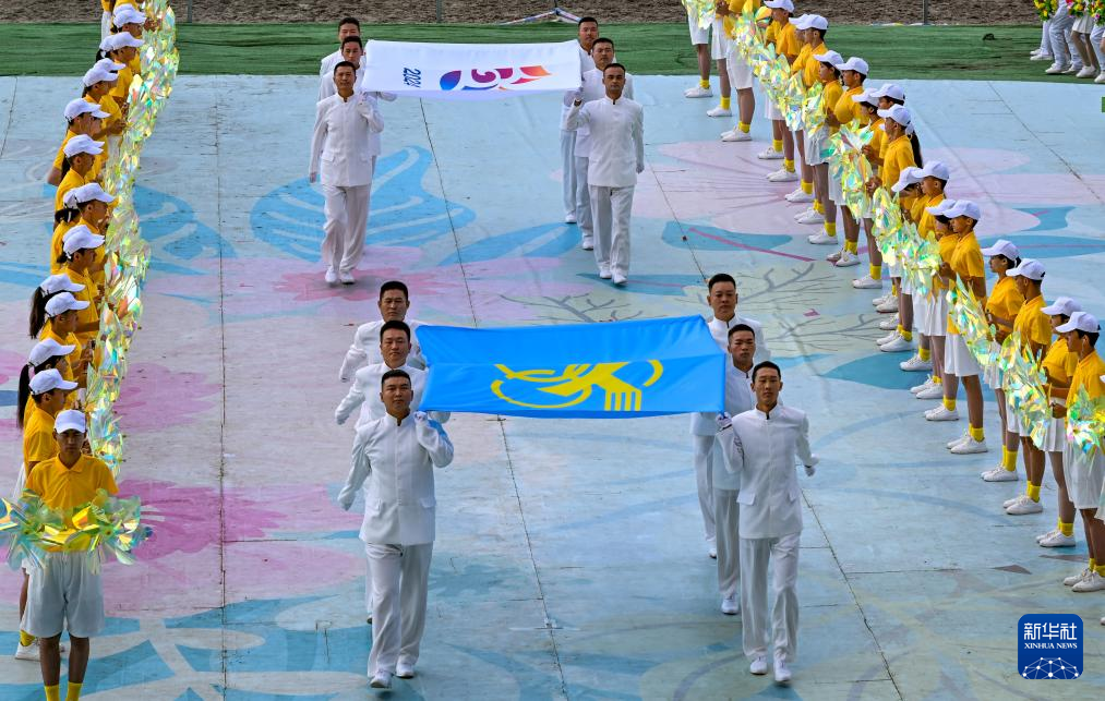 7月8日,全国少数民族传统体育运动会会旗和会徽在开赛仪式上入场。新华社记者 陈朔 摄