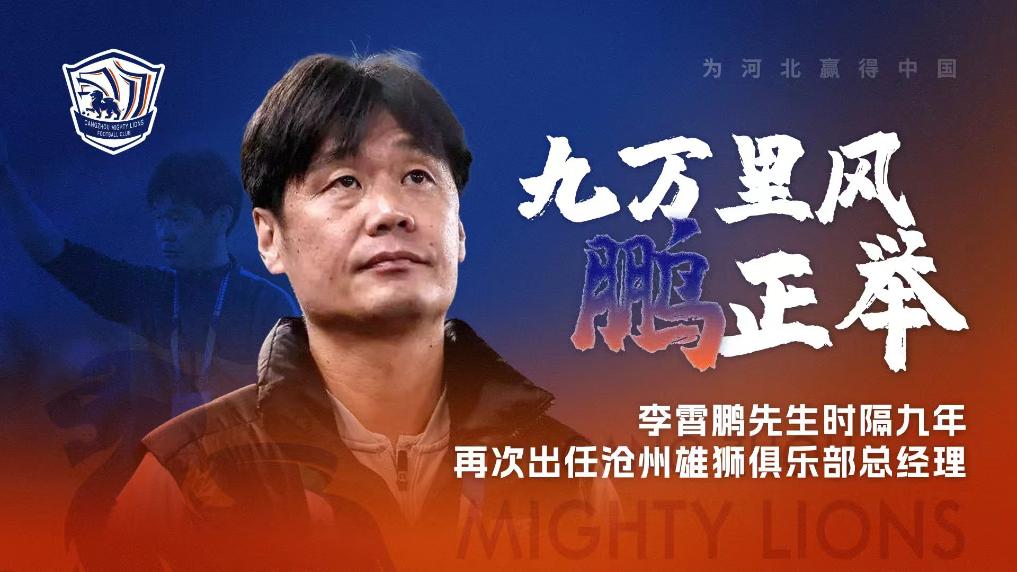 本赛季至今,沧州雄狮4胜4平10负积16分,身处保级泥潭边缘。俱乐部在公告中写道:时隔九年再度回到熟悉的位置,“九万里风鹏正举”,希望他能带领俱乐部再创佳绩。