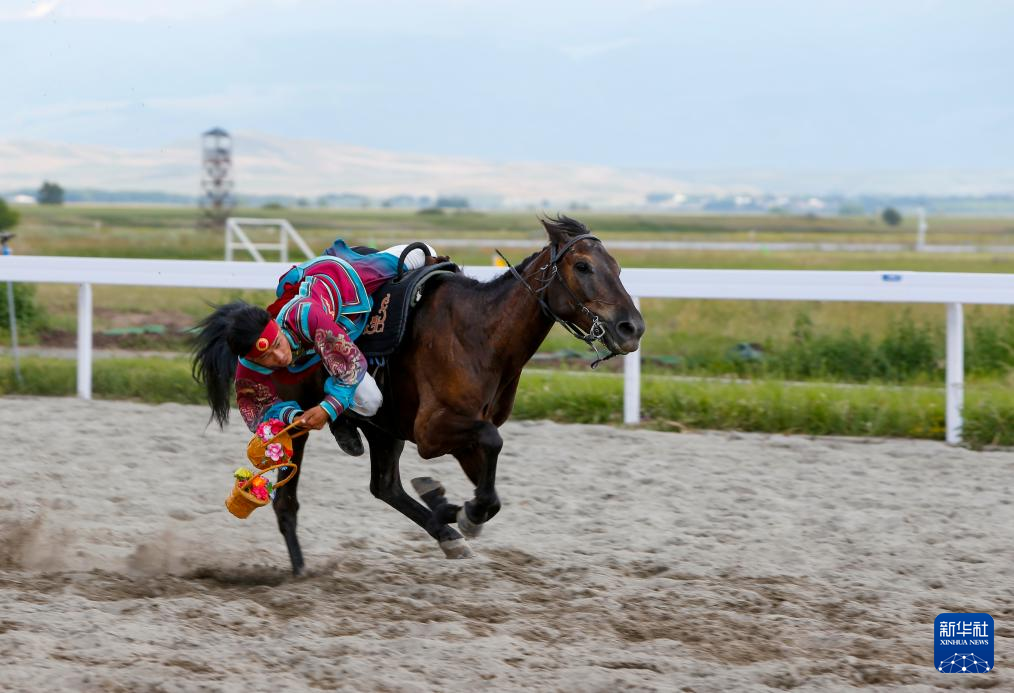 7月8日,内蒙古代表团运动员在表演项目技巧类马上技巧比赛中拾花篮。新华社记者 陈朔 摄