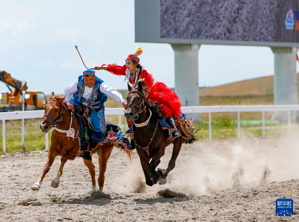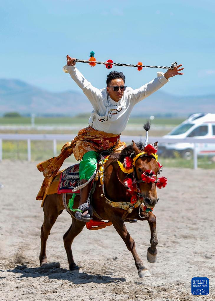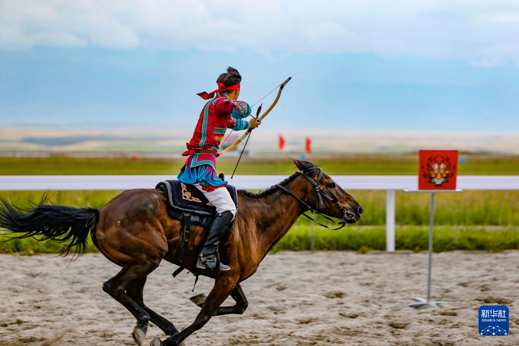 7月8日,青海代表团运动员参加表演项目技巧类乘马抛石比赛。新华社记者 陈朔 摄