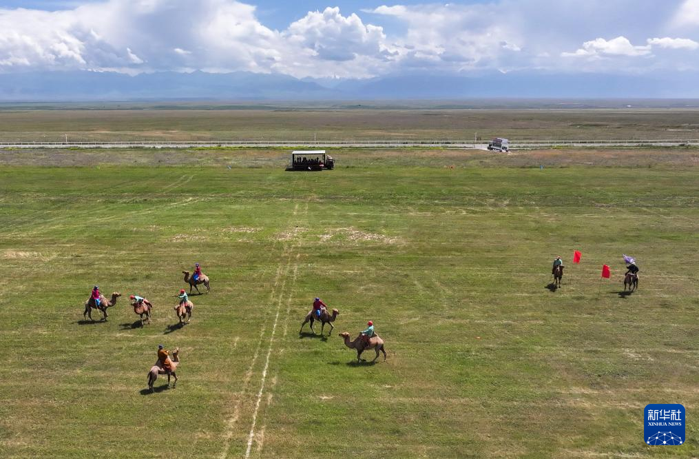 7月8日,内蒙古代表团运动员参加表演项目竞技类驼球比赛(无人机照片)。新华社记者 阿曼 摄