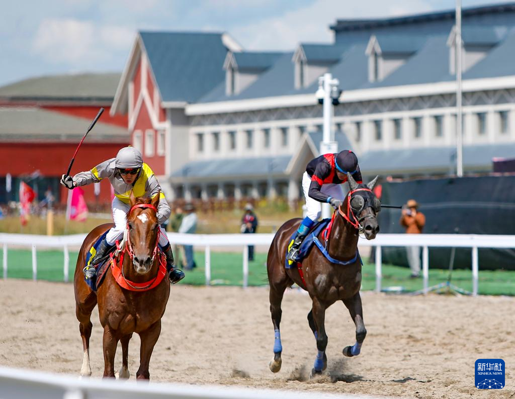 7月8日,海南代表队运动员木吾黑特·叶尔布拉提、赛马“金刚王子”(左)和湖北代表队运动员刘学、赛马“大魔头”(右)在民族赛马2000米比赛中。新华社记者 陈朔 摄