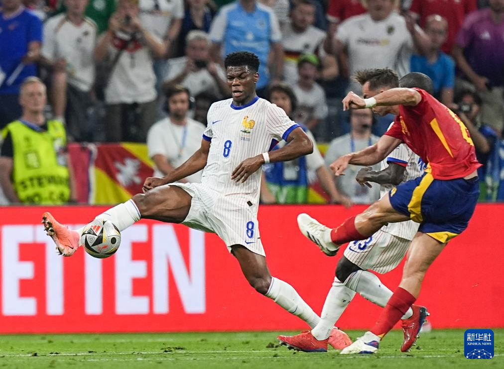 7月9日,西班牙队球员莫拉塔 (右)与法国队球员特奥·埃尔南德斯拼抢。新华社记者 张帆 摄