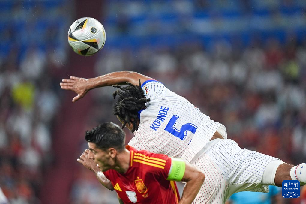 7月9日,法国队球员孔德(右)与西班牙队球员莫拉塔争顶头球。新华社记者 张帆 摄